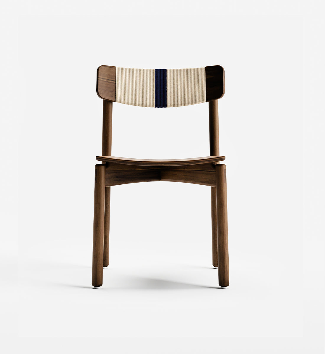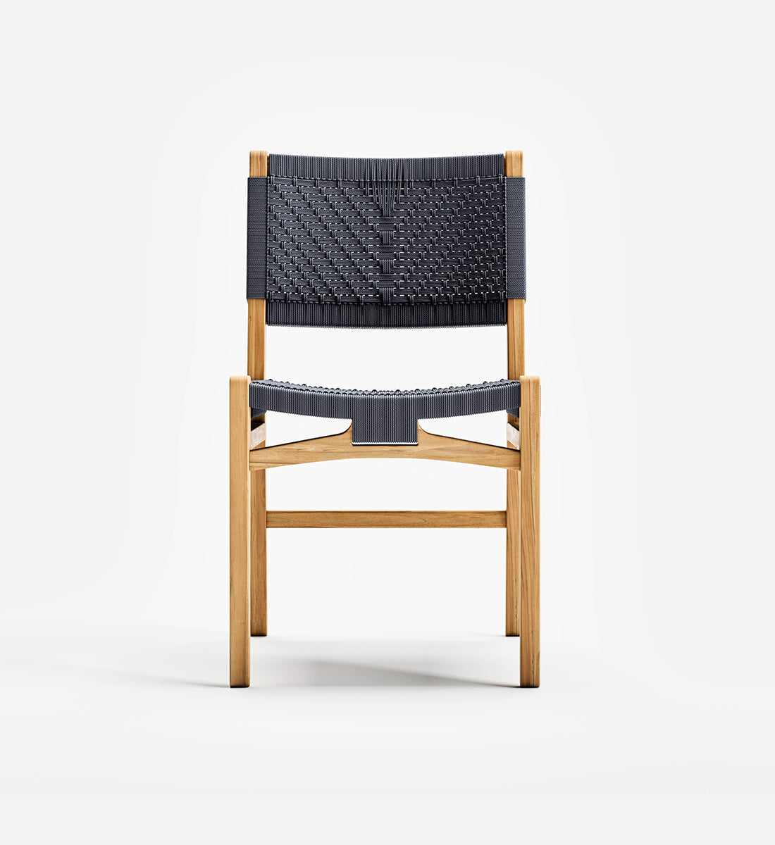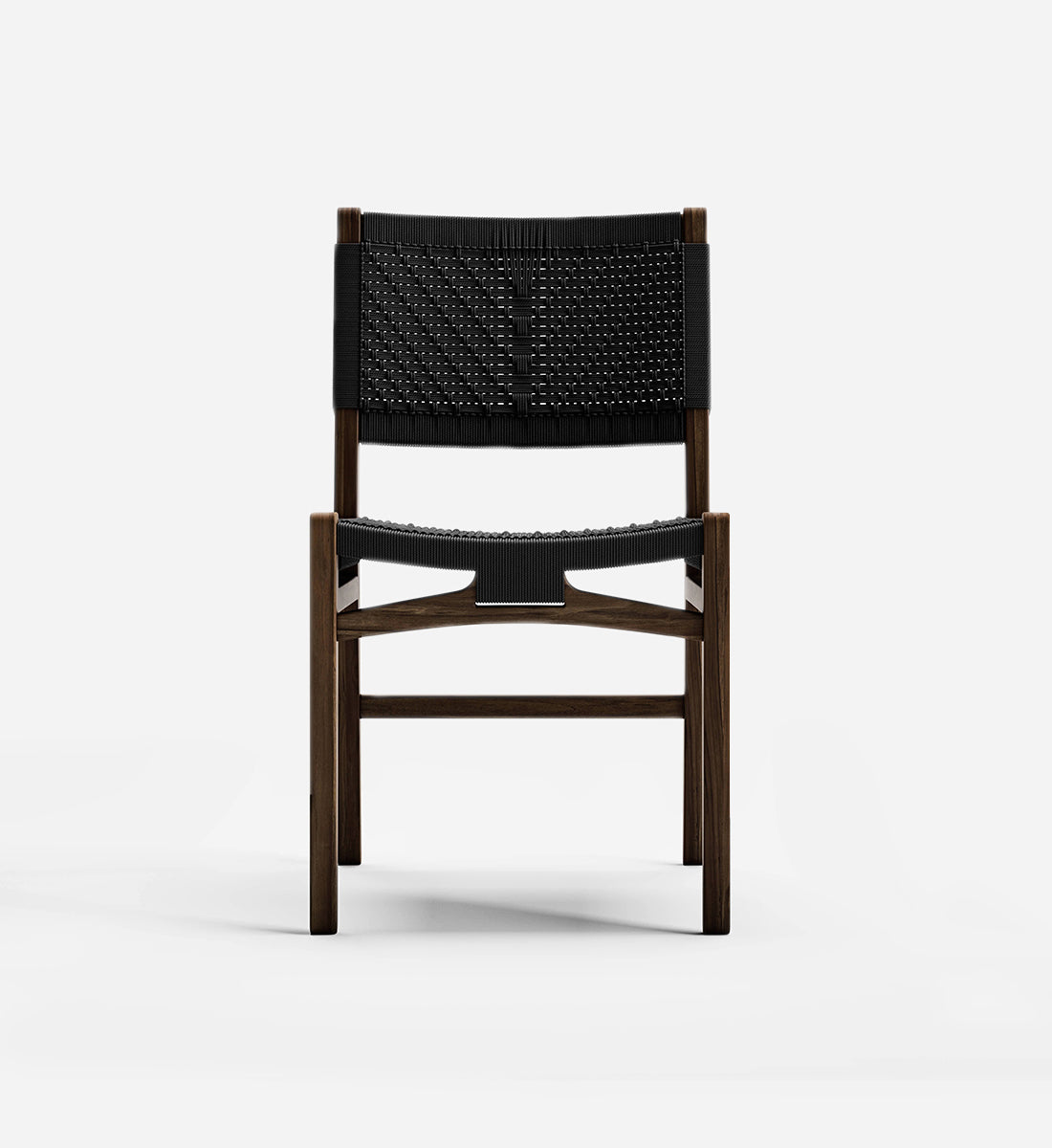 The Amador Dining Chair is handmade from reforested teak. Its gentle curves and intricate textures reflect a love for design and eco-conscious living.