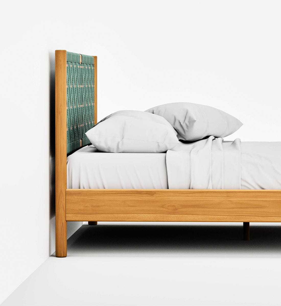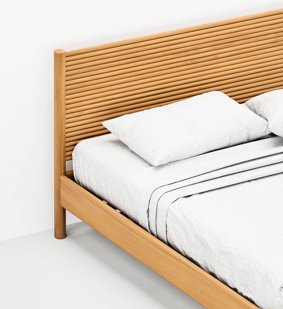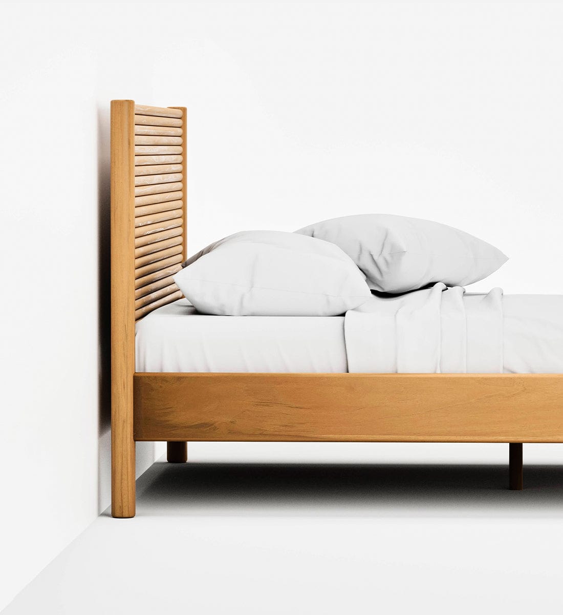 The Catalina Bed with Wooden Back, crafted from FSC® certified teak wood, features a slatted headboard, sturdy construction, and timeless elegance. A sustainable, handcrafted bedroom furniture piece for the eco-conscious.
